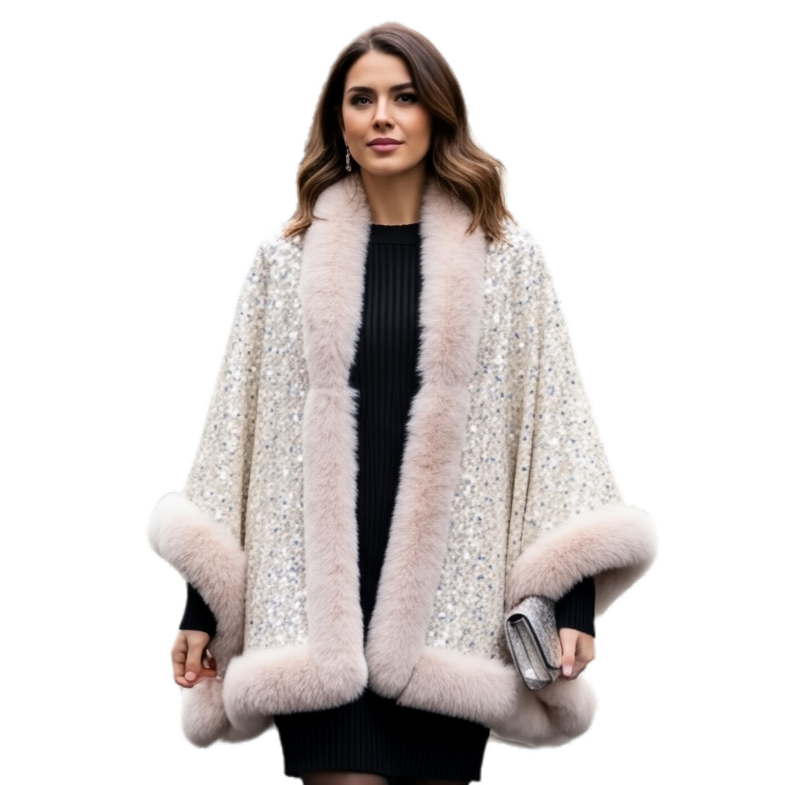 Fur Cloak Metallic Poncho Cape W/Faux Fur Trim
