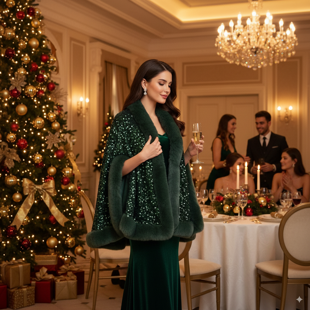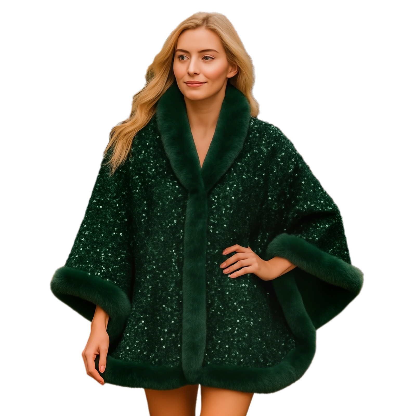 Fur Cloak Metallic Poncho Cape W/Faux Fur Trim