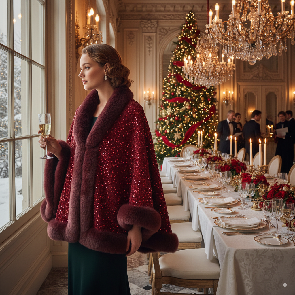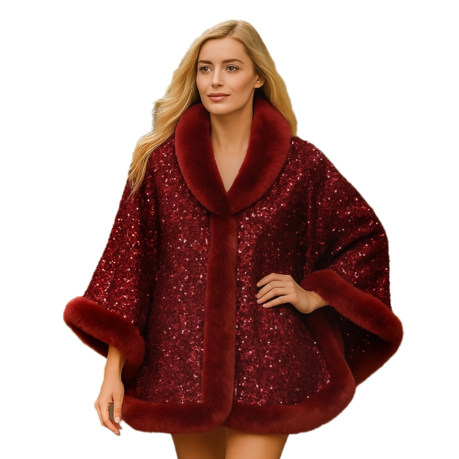 Fur Cloak Metallic Poncho Cape W/Faux Fur Trim