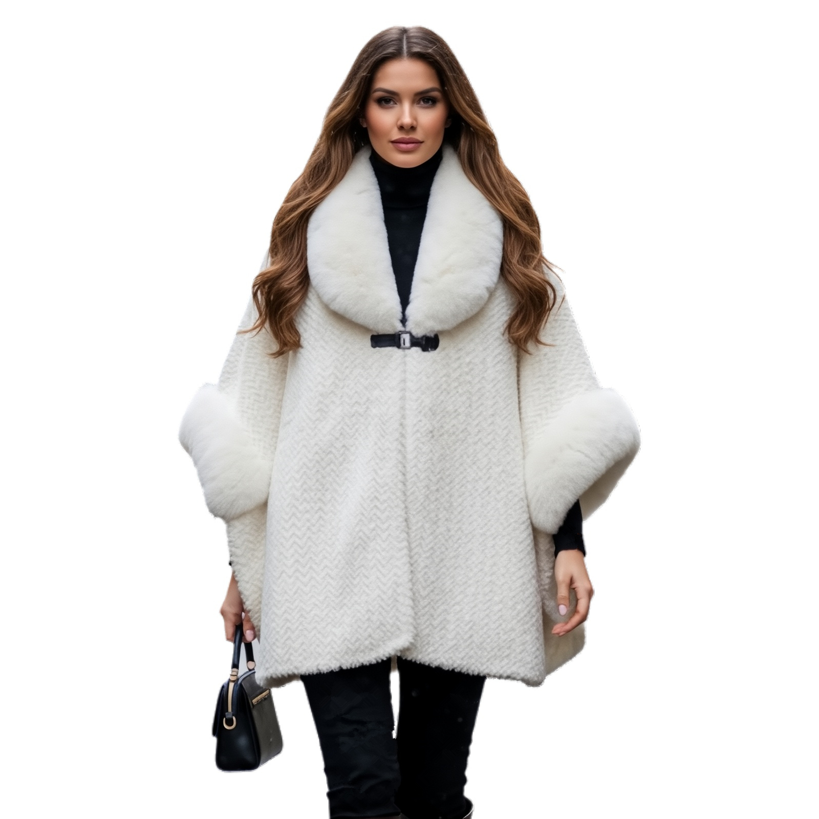 Fur Cloak Furry Poncho Cape W/Faux Fur Trim-White