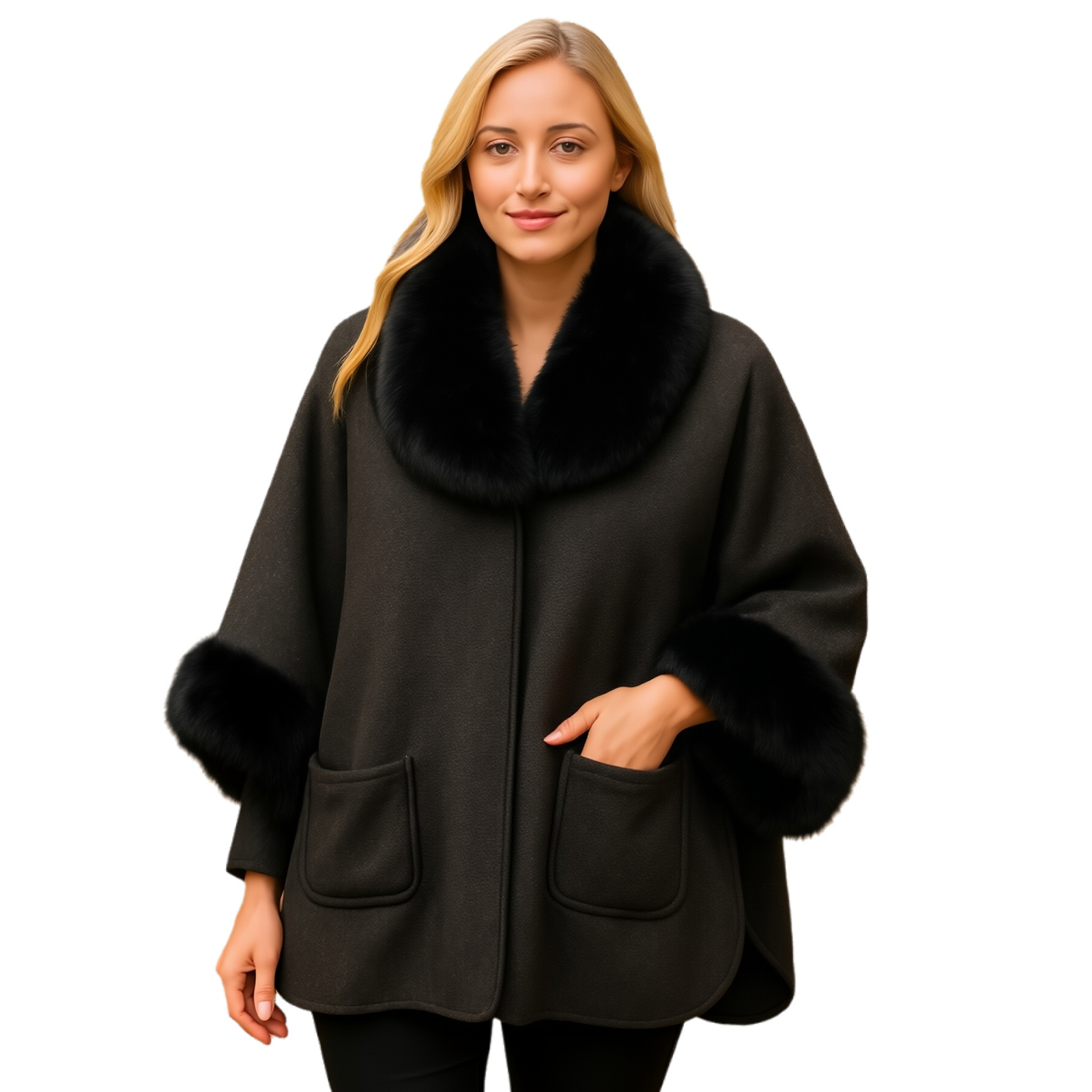 Metallic Faux Fur Cloak Poncho Cape w/Pockets